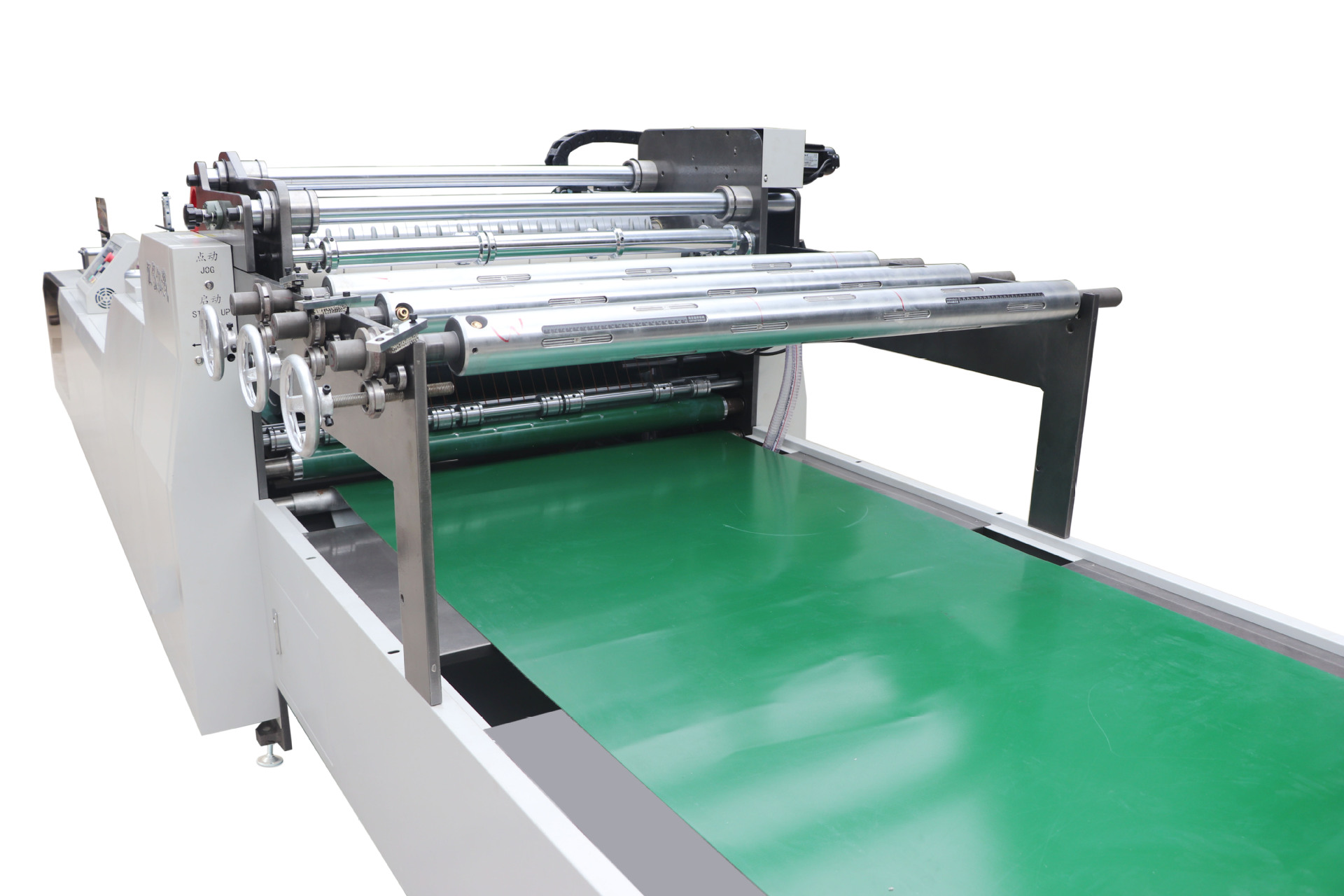 采用3根氣漲軸,電磁張力控制系統(tǒng)讓薄膜放料張力恒定在理想的狀態(tài)使薄膜的精度更高,更換薄膜更方便。