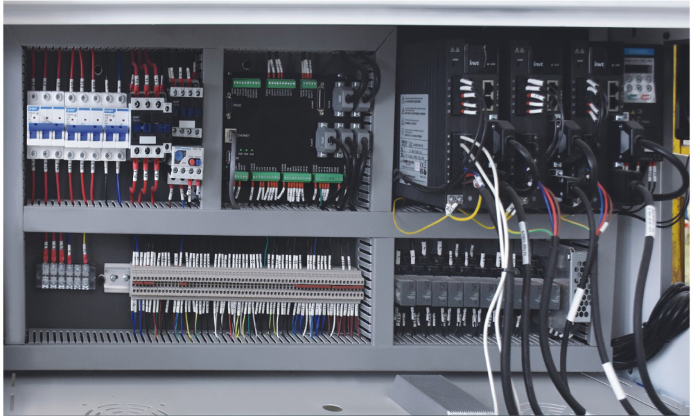 8、電氣系統(tǒng):整機(jī)采用全伺服運(yùn)動控制,各種電氣元件、檢測開關(guān)均采用日本、臺灣、法國、德國等公司產(chǎn)品。